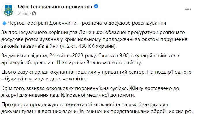 По данным следствия, двое мужчин погибли прямо во дворе жилого дома, когда снаряды попали в частный сектор. А их соседка была ранена осколком, ее доставили в больницу.