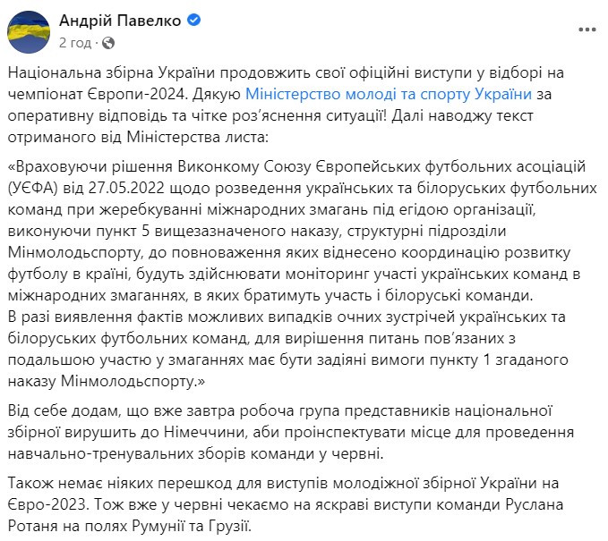 Украинская сборная от участия не будет отказываться. Фото: facebook.com/andriy.pavelko
