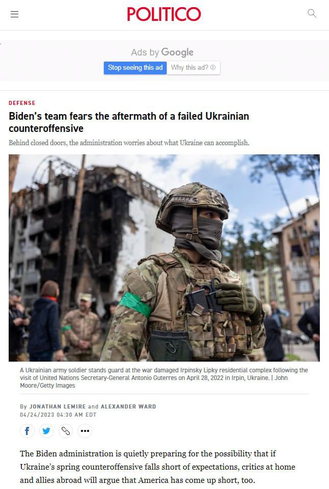Politico также отмечает, что команда Байдена боится последствий, в случае неудачного контрнаступления ВСУ.