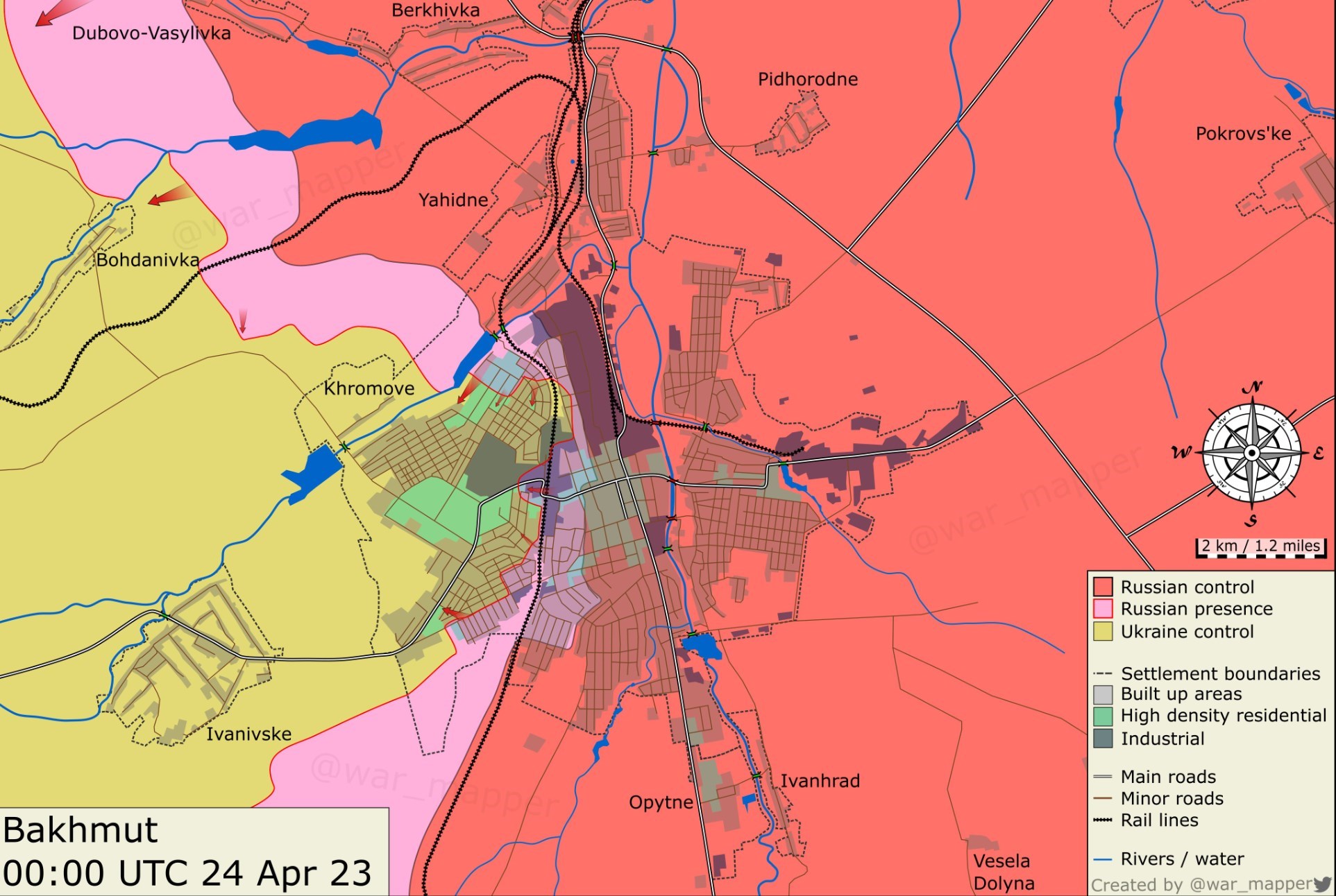 Испанские журналисты сообщают, что основная масса украинской техники выводится из города. Но Украина этой информации не подтверждала, а генерал Сырский, побывавший вчера под Бахмутом, заявил, что оборона продолжается.