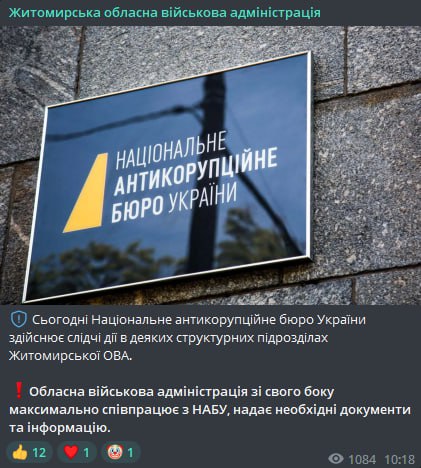 Сегодня с утра НАБУ проводит следственные действия в структурных подразделения Житомирской ОВА.