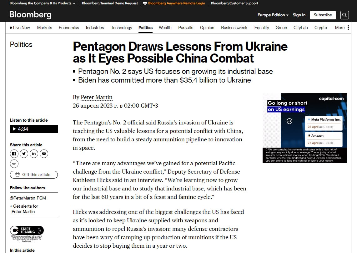 "Есть много преимуществ, которые мы получили для потенциального тихоокеанского конфликта в результате украинского конфликта. Сейчас мы учимся развивать нашу промышленную базу и изучать эту промышленную базу, которая последние 60 лет находилась в цикле "пиршества и голода", - заявила в интервью заместитель министра обороны США Кэтлин Хикс.
