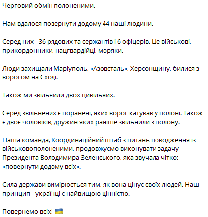 Глава Офиса президента Андрей Ермак сообщает, что в Украину вернулись 44 человека. Среди них – 36 рядовых и сержантов и шесть офицеров.