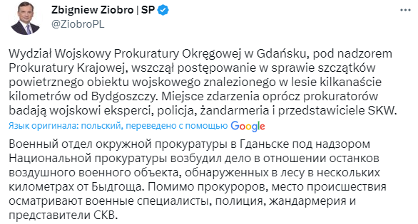 В Польше обнаружены обломки военного объекта с надписями на русском языке. Это может быть ракета или дрон