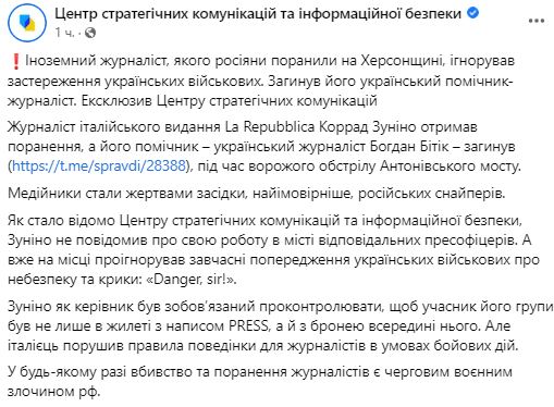 Стали известны подробности гибели украинского журналиста Богдана Битика и ранения его итальянского коллегии Коррадо Зунино на Антоновском мосту в Херсоне. Они проигнорировали предупреждения украинских военных.