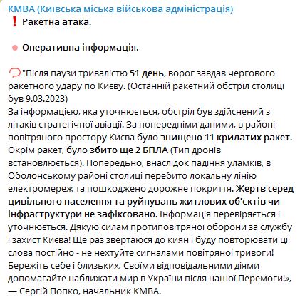 В Киеве, по предварительным данным, в районе воздушного пространства Киева было уничтожено 11 крылатых ракет. Кроме ракет, было сбито еще 2 БПЛА (тип дронов устанавливается).