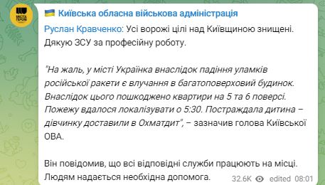 Губернатор Киевской области Руслан Кравченко сообщил, что в результате падения обломков российской ракеты в Украинке есть попадание в многоэтажный дом.