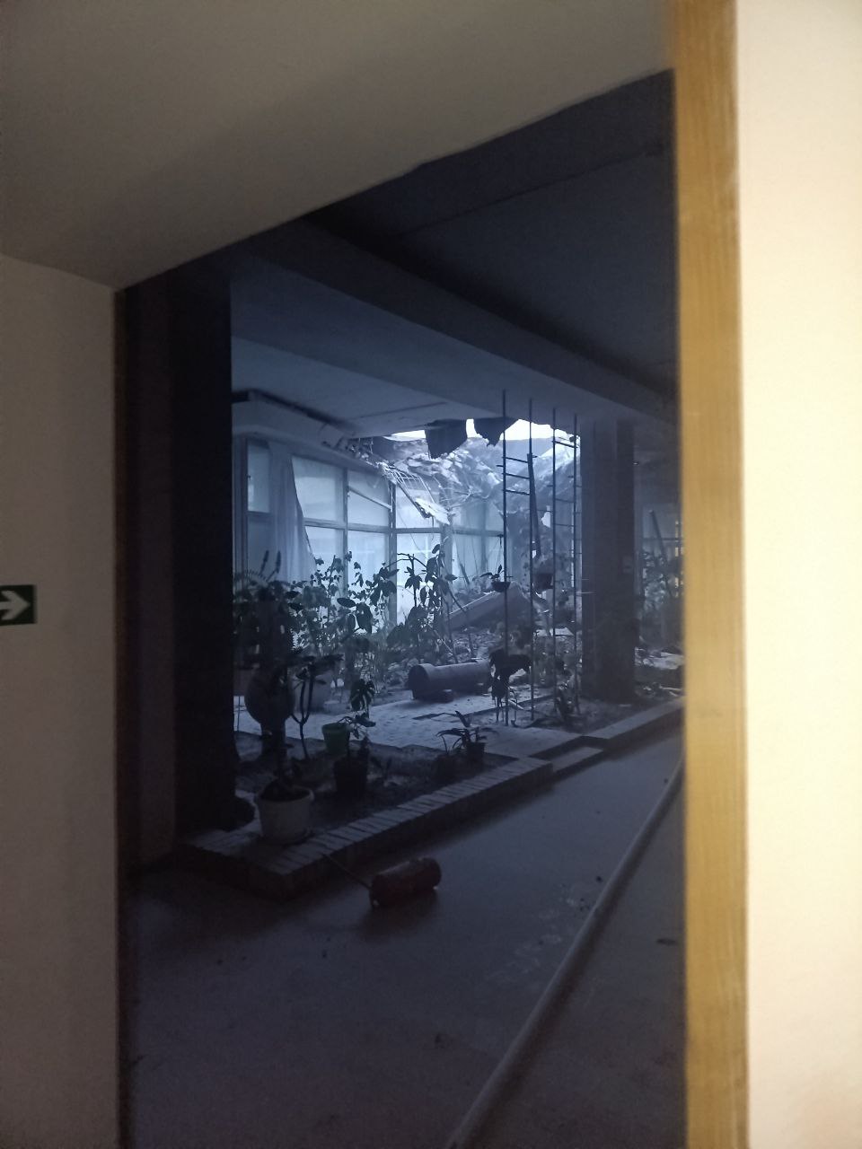 "Когда мы проводили эвакуацию, она (ракета - Ред.) прямо передо мной пробила крышу и упала. Я думал мне звездец, но она не разорвалась... На фото и есть расстояние передо мной и ракетой в холле", - заявил Прошинский.