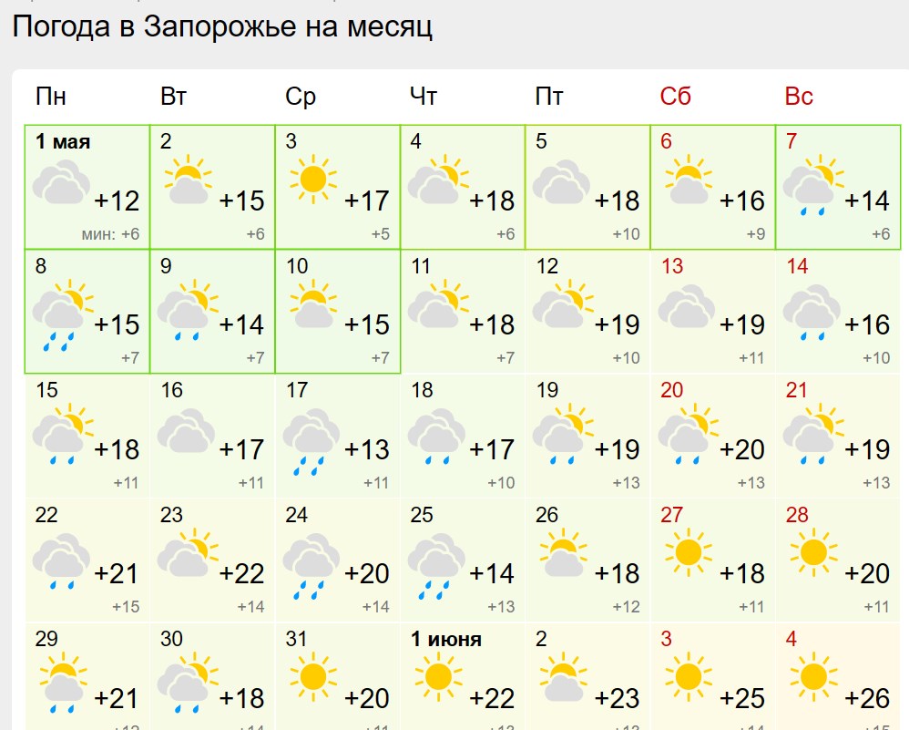 В прифронтовом Запорожье май обещает быть достаточно дождливым на всей протяженности месяца: осадки разной интенсивности предполагаются каждую неделю по 2-3 дня. Наиболее сухой будет первая неделя месяца: там дождь ожидается только в воскресенье, 7 мая.
