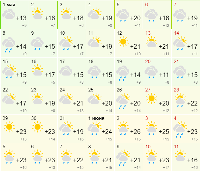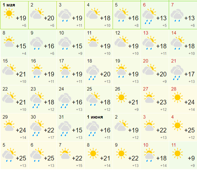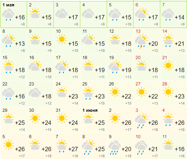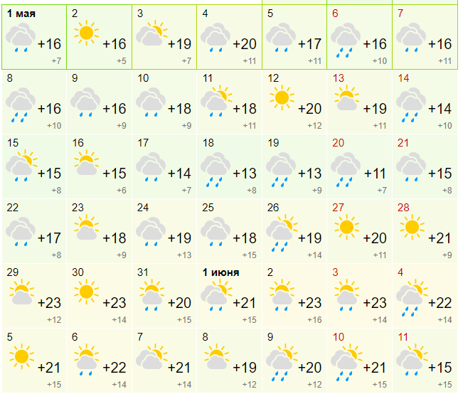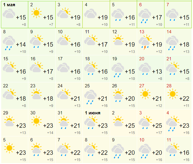 Средняя температура днем — 15 градусов выше нуля. Устойчивые +22 и солнце ожидается в двадцатых числах.