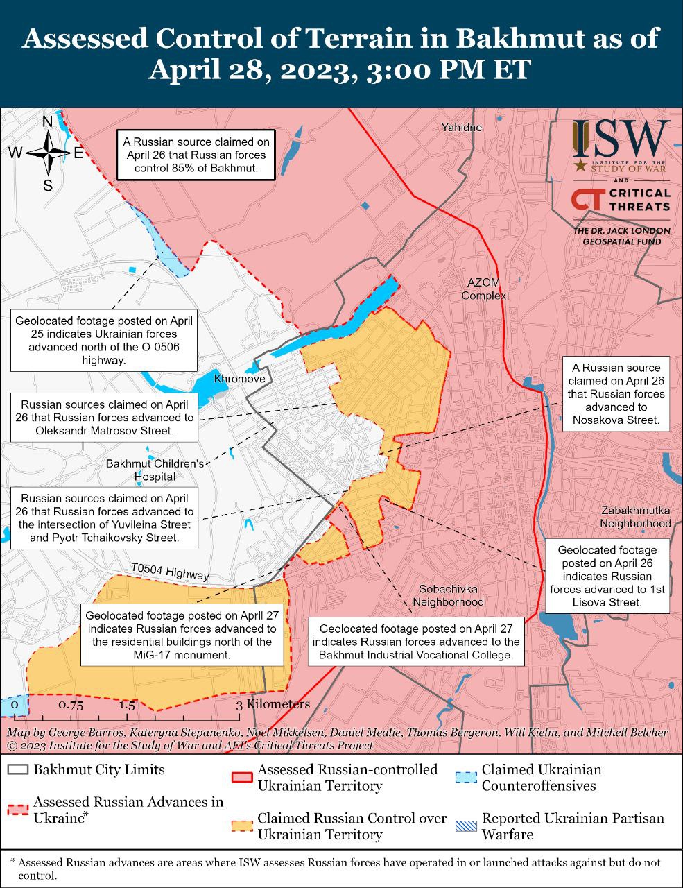 "Институт изучения войны" (США) проанализировал фото и видео с фронта. Кадры, опубликованные 28 апреля, показывают, российские войска продвигаются под Кременной. На фото армию РФ видно примерно в 10 километрах к северо-западу от города.