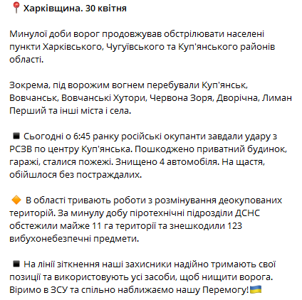 Сегодня утром, 30 апреля, россияне нанесли удар из РСЗО по центру Купянска Харьковской области.