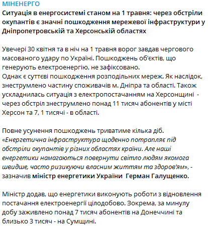 "Как следствие, обесточена часть потребителей Днепра и области. Также усложнилась ситуация с электроснабжением в Херсонской области - из-за обстрела обесточено более 11 тысяч абонентов в Херсоне и 7,1 тысяча - в области", - говорится в сообщении.