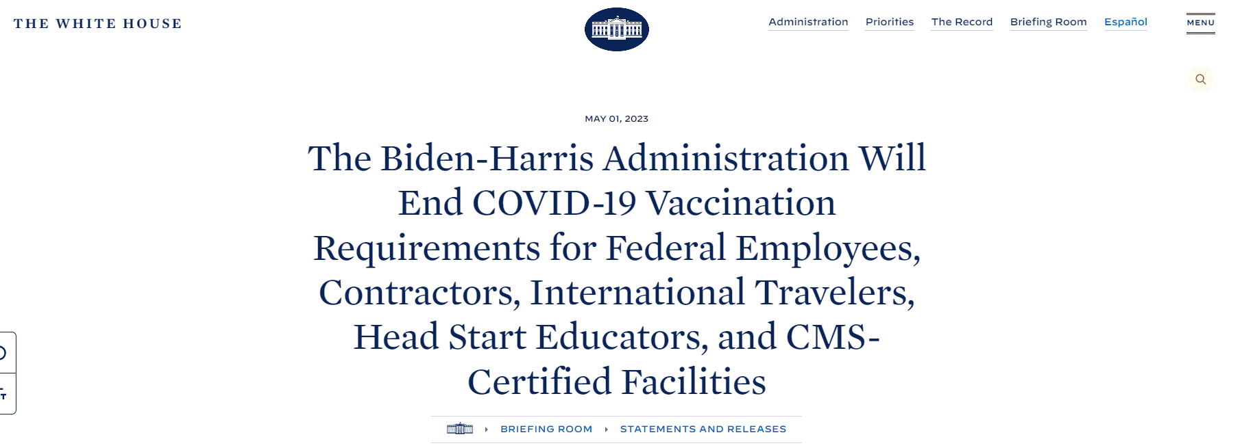 "Сегодня мы объявляем, что администрация отменит требования о вакцинации от COVID-19 для федеральных служащих, федеральных подрядчиков и международных авиапассажиров в конце дня 11 мая. В этот же день завершится чрезвычайная ситуация в области общественного здравоохранения в связи с COVID-19", - говорится в документе.