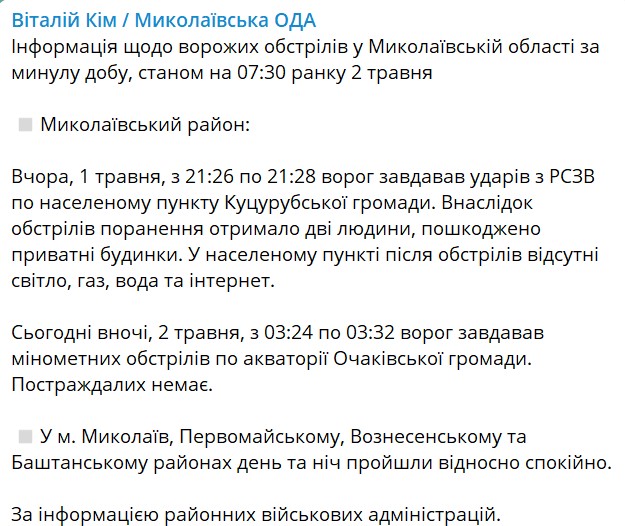 В Николаевской области вчера вечером россияне из РСЗО ударили по населенному пункту Куцурубской общины. Были ранены два человека, повреждены частные дома, пропал свет, газ, вода и интернет.