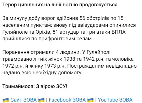 В Запорожской области под авиаударами оказались Гуляйполе и Орехов, ранения получили четыре человека. В Гуляйполе пострадали пожилые женщины 1938 и 1942 г.р., мужчина 1972 г.р. и женщина 1973 г.р.