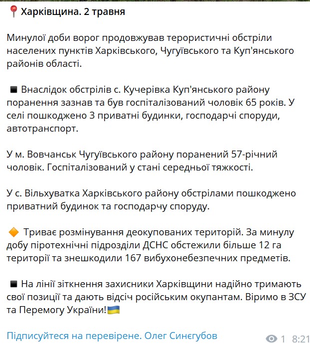 В Харьковской области был ранен 65-летний житель с. Кучеривка Купянского района. В селе повреждены три частных дома, хозяйственные постройки и автотранспорт. В Волчанске ранен 57-летний мужчина.