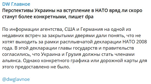 Напомним, что в этой декларации главы государств и правительств согласились, что Украина и Грузия должны стать членами альянса, но без конкретного графика или дорожной карты.