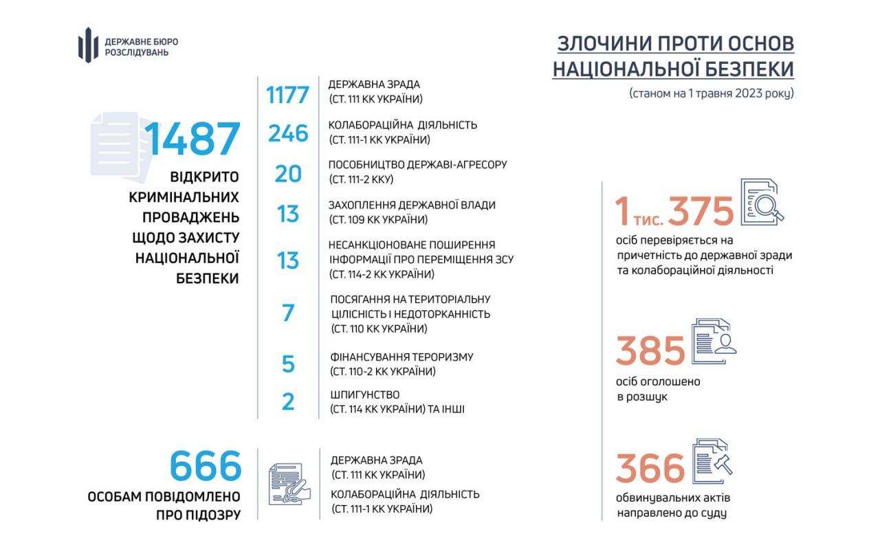С начала вторжения ГБР расследует 1177 уголовных производств по факту госизмены (ст.111 УК). Также рассматривает 226 уголовных дел по факту коллаборационизма (ст.111-1 УК).
