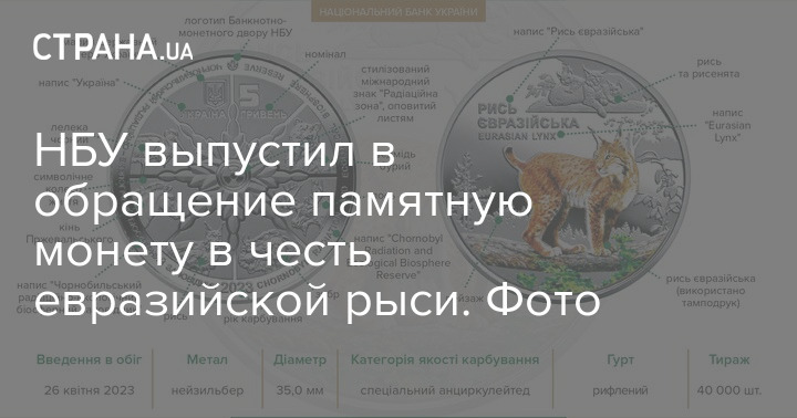 Нацбанк Украины ввел в обращение третью памятную монету из серий "Чернобыль. Возрождение", "Флора и фауна". Она посвящена когда-то привычному, а ныне редкому и занесенному в Красную книгу Украины виду – евразийской рыси.