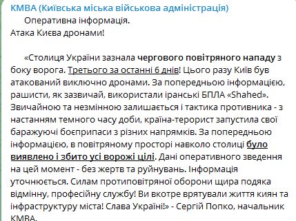 В этот раз Киев был атакован исключительно дронами. По предварительной информации, это были иранские БПЛА Shahed.