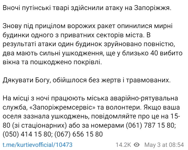Как уточнил секретарь Запорожского городского совета Анатолий Куртев, под прицелом российских ракет оказались мирные дома одного из частных секторов города.