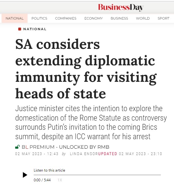 Такой вариант рассматривается в контексте скорого саммита БРИКС, на который должен был бы приехать президент РФ Владимир Путин. ЮАР является подписантом Римского статута и должна будет его арестовать, чего делать власти Республики не хотят.