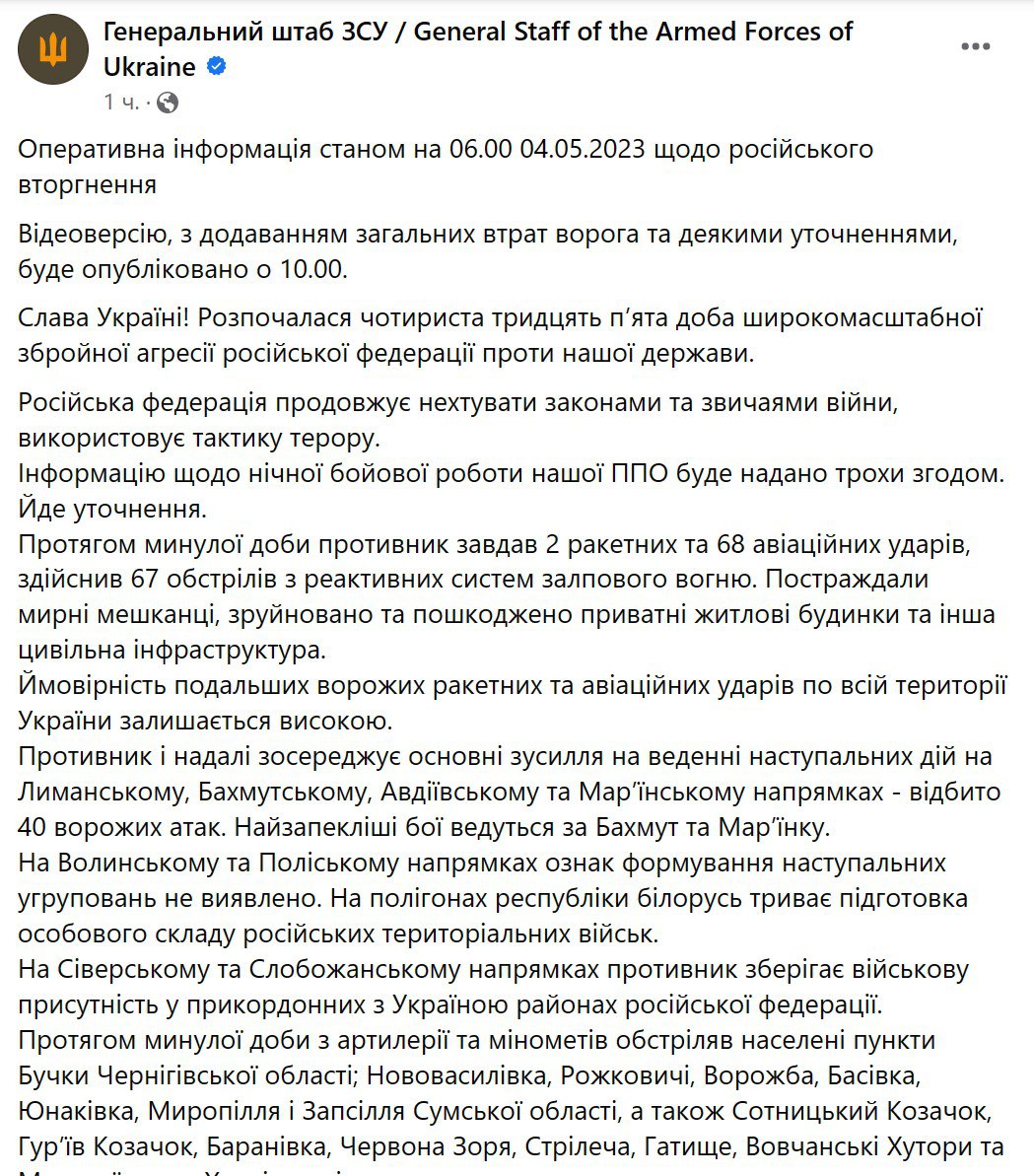 Тем временем война в Украине продолжается уже 435-й день. Мы следим за новостями 4 мая в своем онлайне.