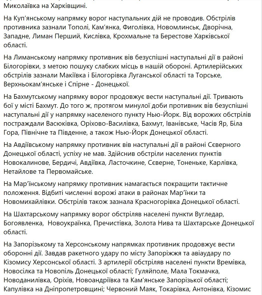 ВСУ отразили 40 атак противника за минувшие сутки. Самые ожесточенные бои ведутся за Бахмут и Марьинку.