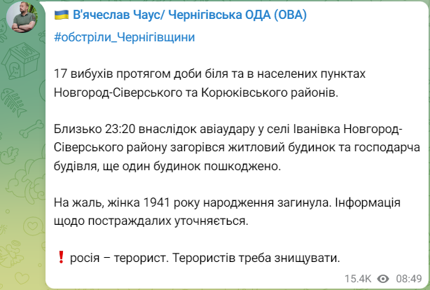 В Ивановке Черниговской области в результате удара авиабомбы погибла пожилая женщина 1941 года рождения, трое мужчин ранены. Повреждено здание учебного заведения и другие сооружения.