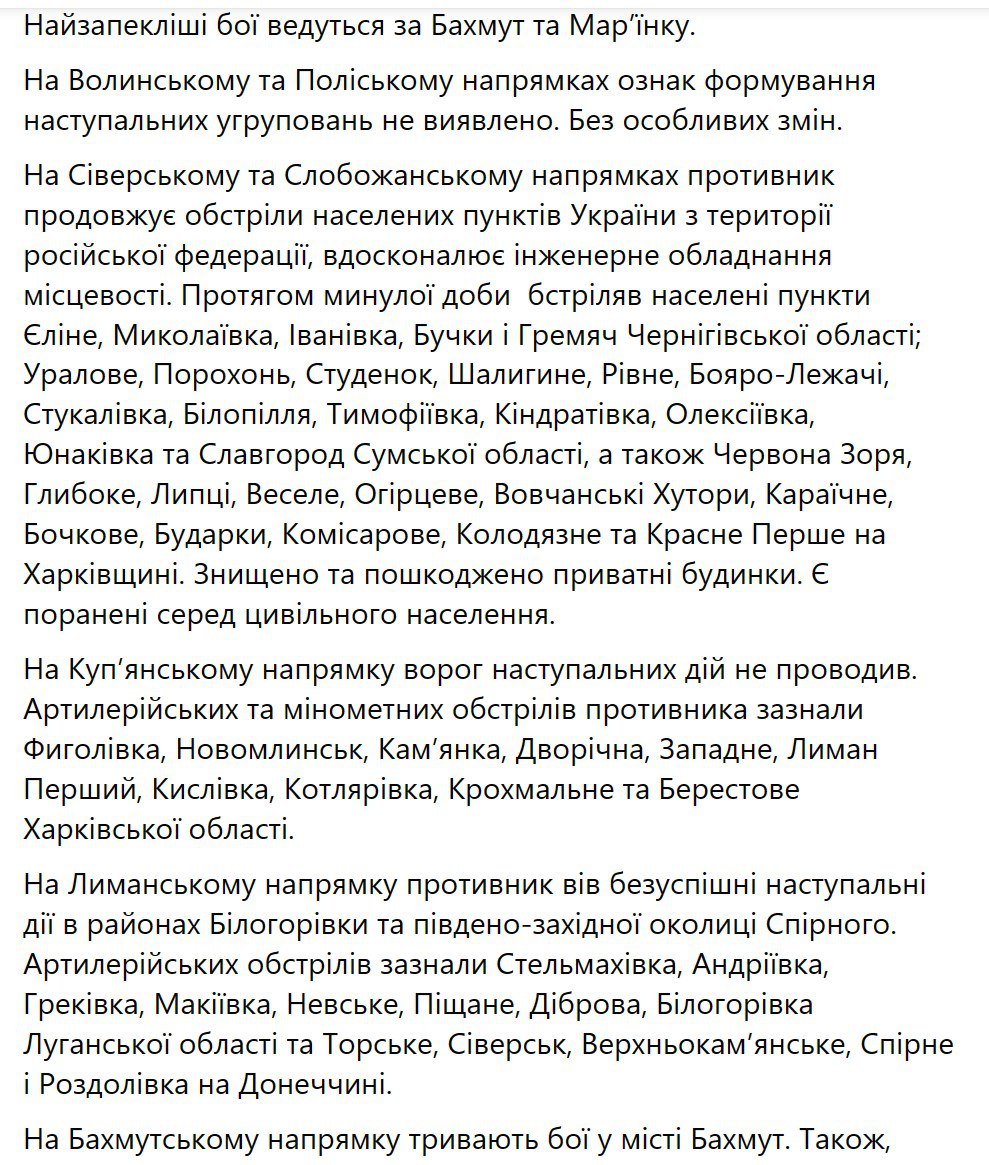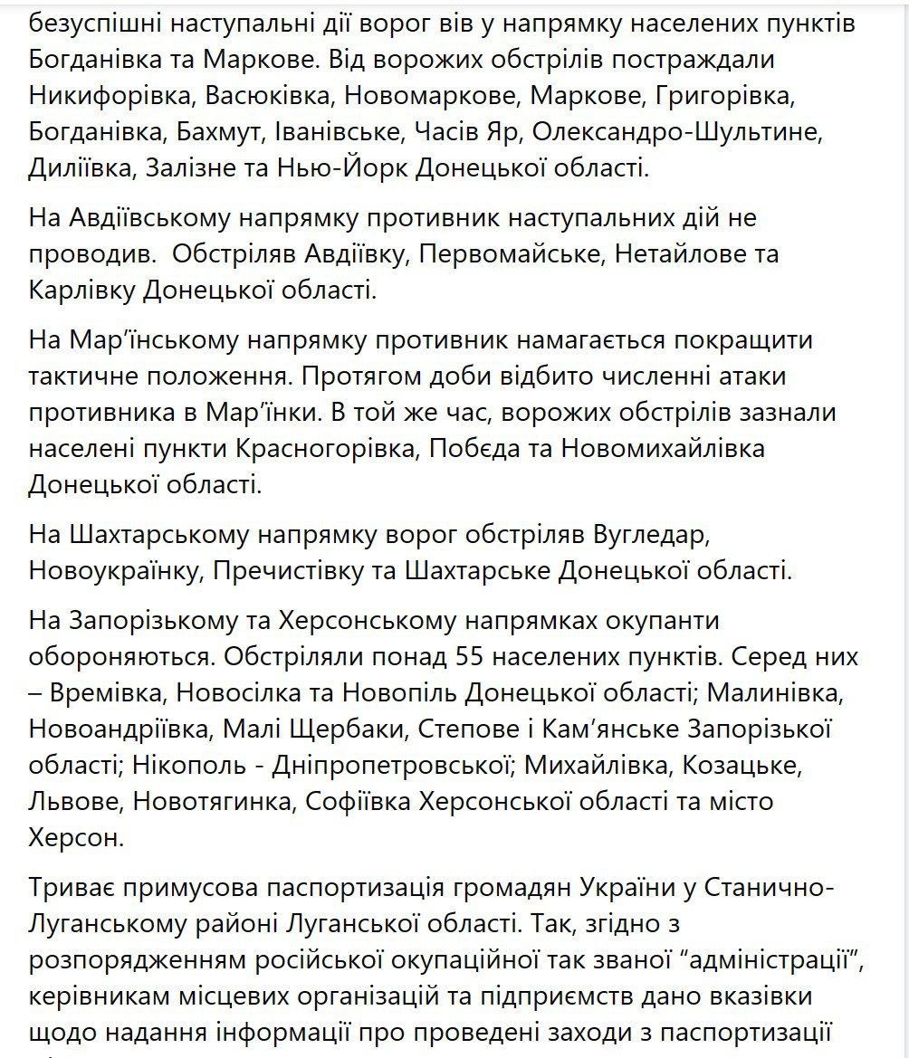Помимо боев за Бахмут, противник атаковал Богдановку и Марково. Также отражены многочисленные атаки противника у Марьинки.