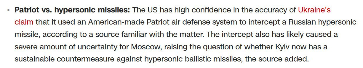 08.50 Источники телеканала CNN в CША считают точными заявления Украины о сбитии ракеты "Кинжал" из комплекса "Пэтриот".