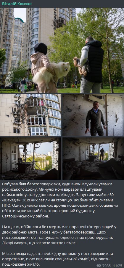 11.35 Мэр Киева Виталий Кличко сообщил, что этой ночью по Украине выпустили "почти 60 дронов".