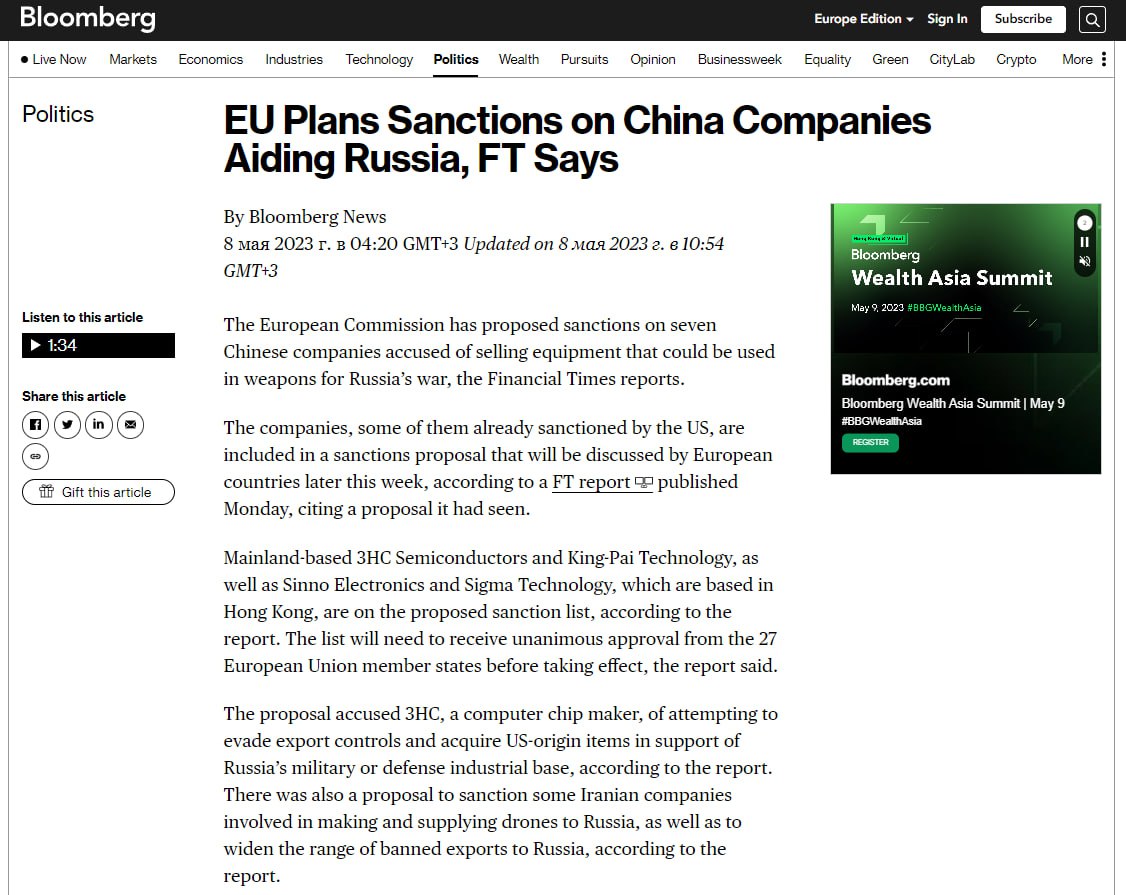 12.30 Еврокомиссия впервые собирается внести в санкционный список 7 компаний из Китая, поставляющие в Россию оборудование, которое может быть использовано в военных целях, пишет Financial Times.