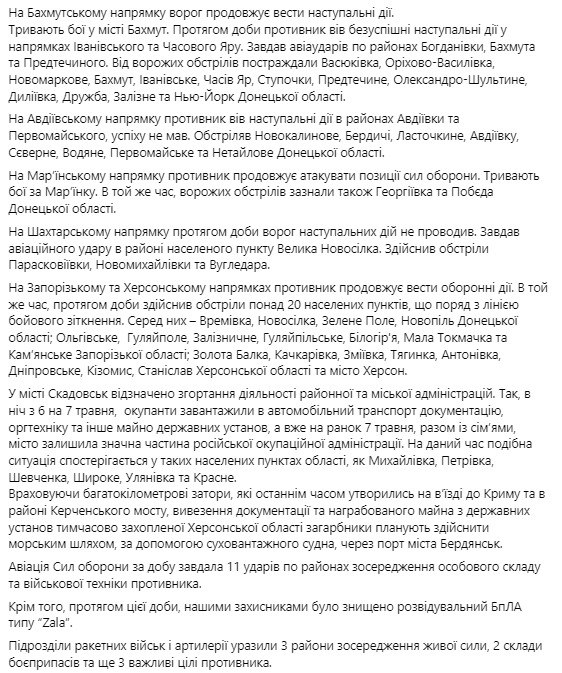 3. Противник сосредоточил основные усилия на Лиманском, Бахмутском, Авдеевском и Марьинском направлениях. Продолжаются тяжелые бои за города Бахмут и Марьинка. За прошедшие сутки было отражено 55 атак на этих участках фронта.