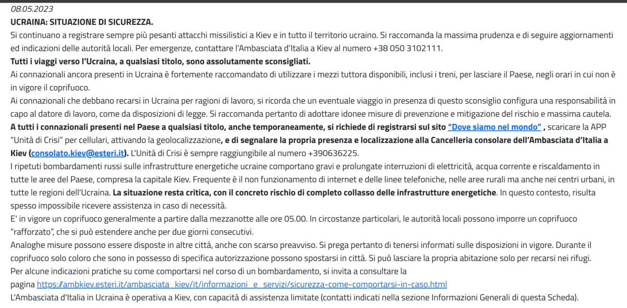 "В Киеве и на всей территории Украины продолжают регистрировать все более сильные ракетные обстрелы. Рекомендуется проявлять максимальную осторожность и следить за обновлениями и указаниями местных властей…