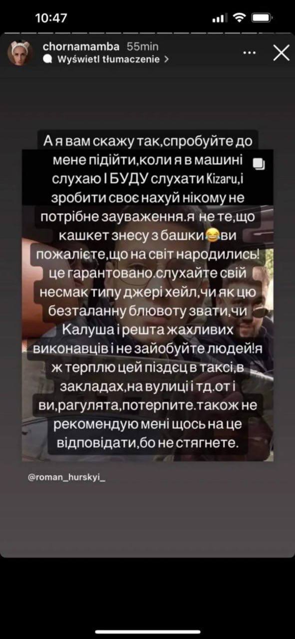 "Попробуйте ко мне подойти, когда я в машине слушаю и буду слушать Кизару, и сделать свое н@х@й никому не нужное замечание. Я не то, что кашкет снесу с башки, вы пожалеете, что родились! Это гарантировано. Слушайте свою безвкусицу типа Джерри Хейл, или как эту бесталанную блев@ту зовут, или Калуша и других ужасных исполнителей и не за@бывайте людей! Я ж терплю этот п@здец в такси, в заведениях, на улице, вот и вы, рагулята, потерпите. Также не рекомендую мне что-то на это отвечать, потому не потащите", - написала она.