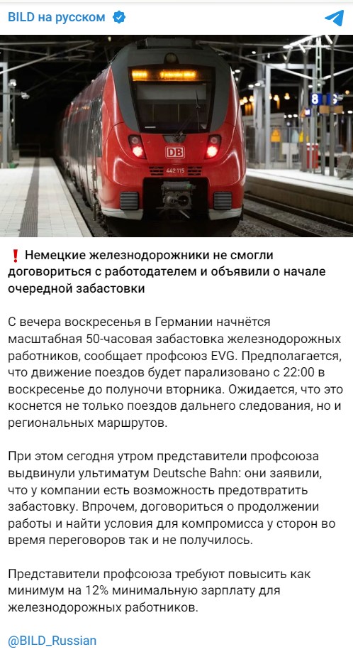 Напомним, в конце марта в Германии прошла крупнейшая за 30 лет забастовка железнодорожников и авиаперевозчиков. Организаторы - профсоюзы EVG и Verdi. Verdi призывали увеличить зарплату работникам на 10,5 процента, причем не менее 500 евро в месяц. Союз EVG выступал за повышение зарплаты работникам немецких железных дорог на 12 процентов, но не менее чем на 650 евро в месяц.