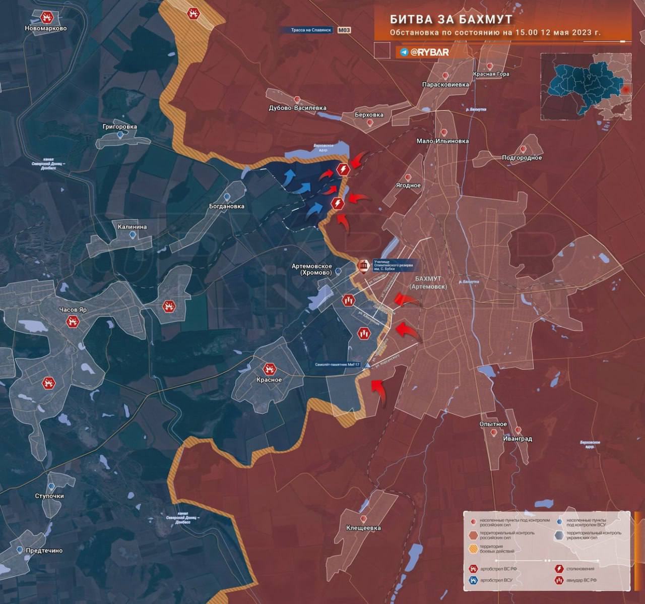 Минобороны (в лице замминистра Анны Маляр) и Владимир Зеленский заявили, что ВСУ продвинулись на Бахмутском направлении вперед, не уточняя, где именно. Говорилось только, что на два километра (и об этом было известно от Пригожина и ряда украинских командиров еще с 9 мая).