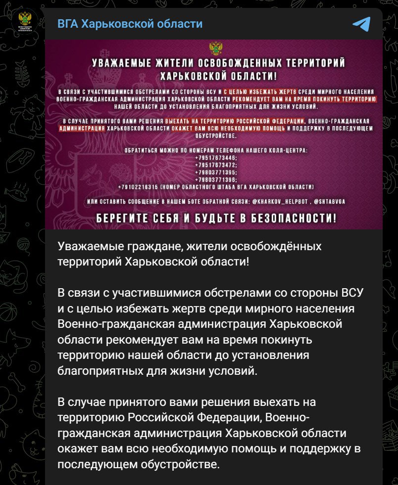 09:30 Назначенные Россией "власти Харьковской области", контролирующие небольшую территорию на востоке региона, объявили об эвакуации.
