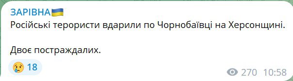 Также советник Ермака Дарья Заривная сообщила об ударе по Чернобаевке Херсонской области: здесь пострадало двое.