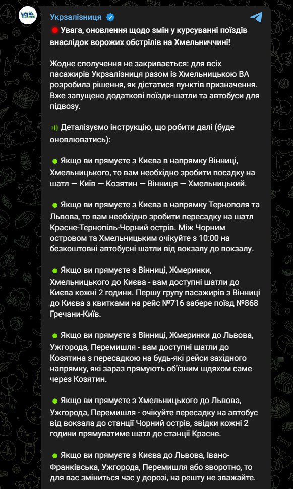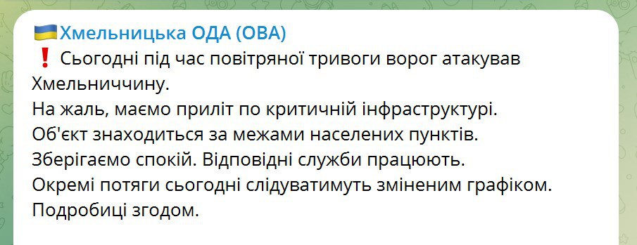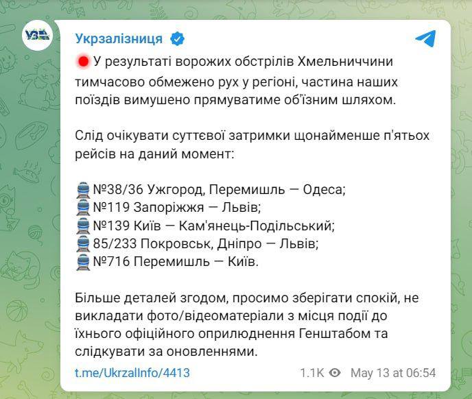 Напомним, сегодня ночью под Хмельницким был поражен объект инфраструктуры, из-за чего остановлено движение поездов через эти участки.