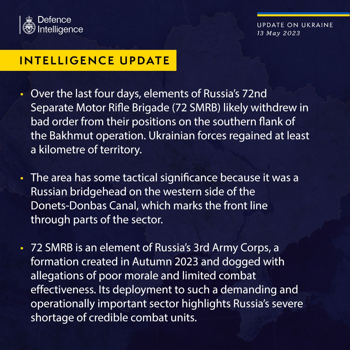 "За последние четыре дня части российской 72-й отдельной мотострелковой бригады, вероятно, беспорядочно отступили со своих позиций на южном фланге Бахмутской операции. Украинские силы отвоевали не менее километра территории.