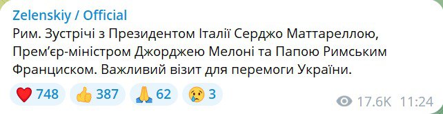 14:49 Владимир Зеленский в Риме встретился с президентом Италии Серджо Маттареллой и премьером Джорджей Мелони.