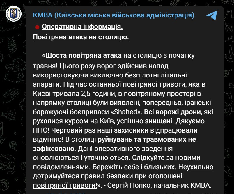 "В столице разрушений и травмированных не зафиксировано", - заявил глава КГВА Сергей Попко. Он уточнил, что это шестая воздушная атака на столицу с начала мая.