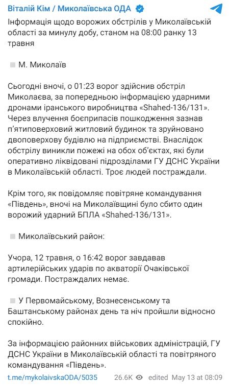 09:17 В ночь на 13 мая по Украине был 21 пуск "Шахидов", сообщает Воздушное командование Украины. Уничтожены 17 из них.