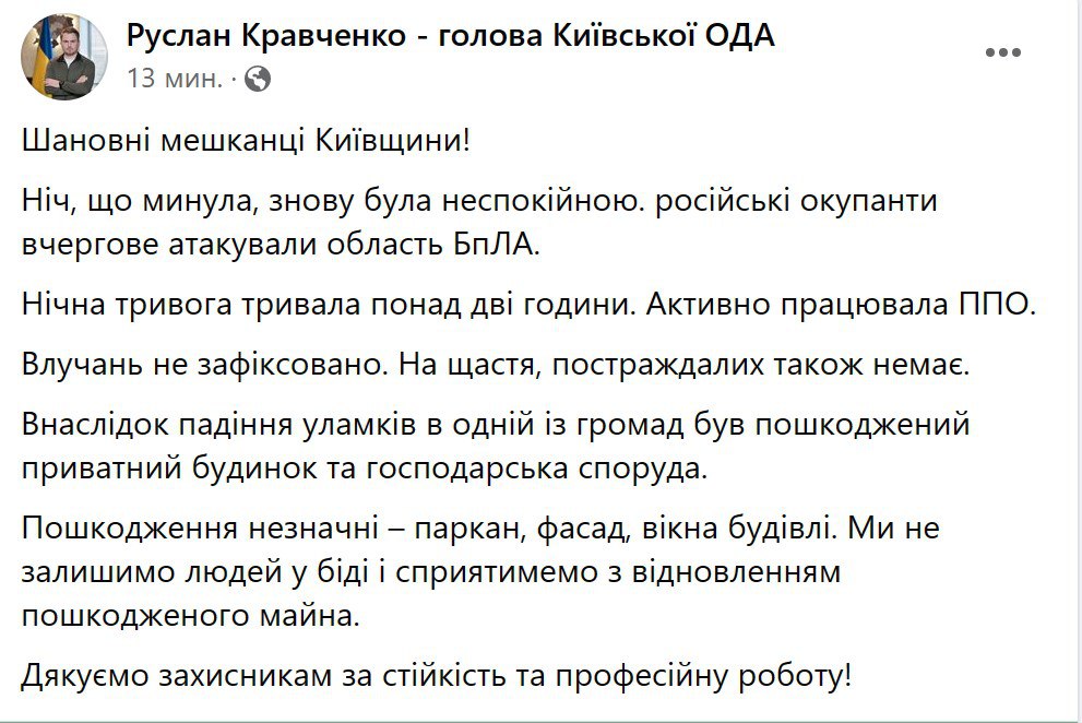 10:12 В Киевской области из-за падения обломков дрона поврежден частный дом и хозяйственная постройка.