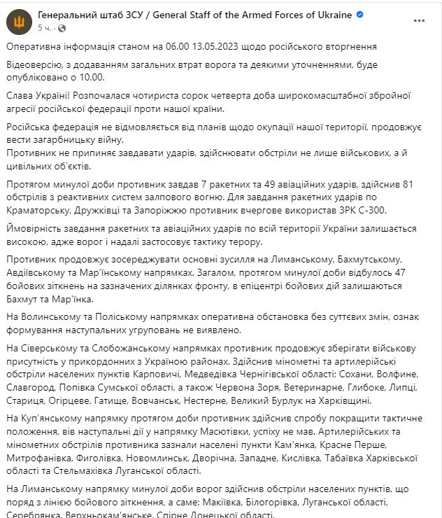 В субботу, 13 мая, в Украине идет уже 444-й день войны с РФ.