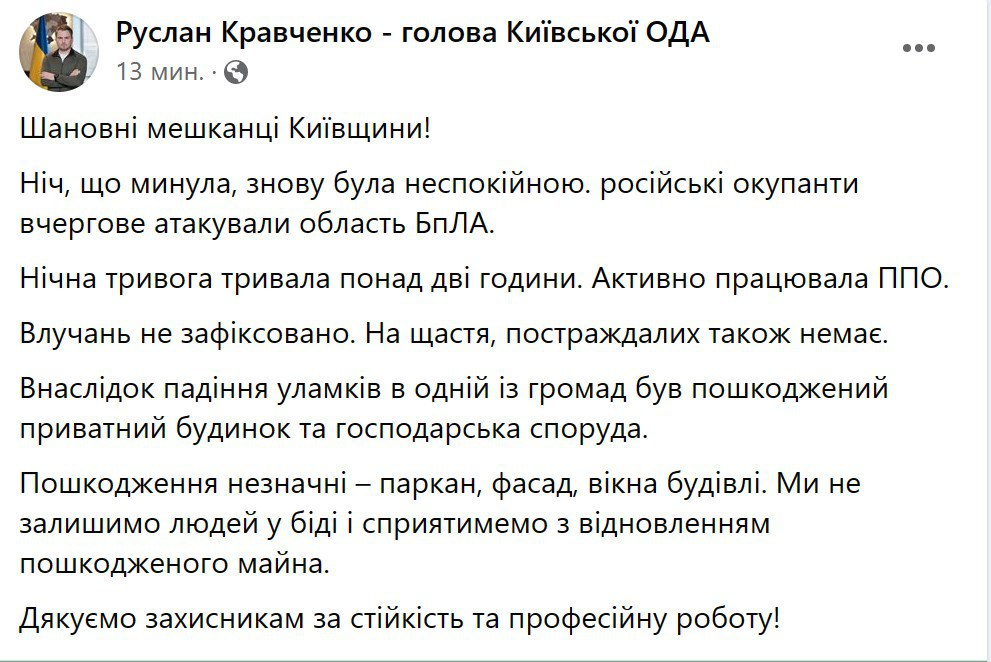 "Прошедшая ночь снова была беспокойной. Российские оккупанты в очередной раз атаковали область БПЛА. Ночная тревога продолжалась более двух часов. Активно работала ПВО. Попаданий не зафиксировано. К счастью, пострадавших тоже нет. В результате падения обломков в одной из общин был поврежден частный дом и хозяйственная постройка. Повреждения незначительные – забор, фасад, окна здания", - заявил Кравченко.