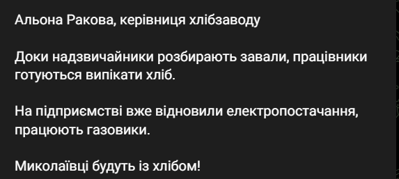 "Уважаемые партнеры, дорогие потребители, к сожалению, вы сегодня из СМИ услышали про то трагическое событие, которое произошла на предприятии. Но все люди живы и на предприятии, надеемся, с организованной работой и поддержкой областной военной администрации, работниками мэрии, "Облэнерго" и "Облгаза" у нас будет свет, газоснабжение и мы будем поставлять в дальнейшем хлебобулочные изделия по всем торговым точкам. Всю информацию в дальнейшем мы будем сообщать в более оперативной форме, заказывайте на завтра хлеб", - заявила руководитель хлебозавода Алена Ракова.